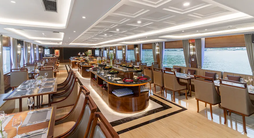 Indulge in a flavorful celebration of the sea with a diverse buffet or refined set menu featuring fresh-caught seafood and Vietnamese specialties. As the sun dips below Halong’s limestone peaks, elevate the experience with a French-style sunset canapé party, served with sparkling drinks on the sundeck.
