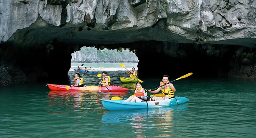 Enjoy a curated range of enriching outdoor experiences. Paddle through limestone karsts on kayaks or traditional bamboo boats, or relax in the vast 300m² four-season saltwater pool—the largest of its kind on any Halong Bay cruise. Leisure or thrill? You choose.