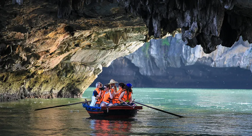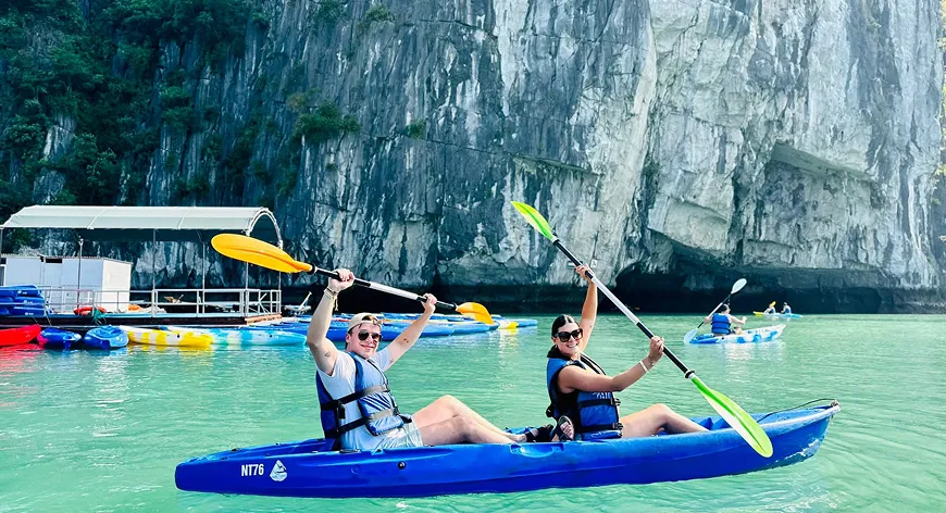 Embark on curated excursions to iconic sites like Sung Sot Cave, Luon Cave, and Titov Island via kayaking, bamboo boat rides, or short nature hikes. On board, guests can unwind with jacuzzi sessions, music at sunset, and crafted beverages under the open sky.