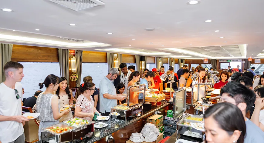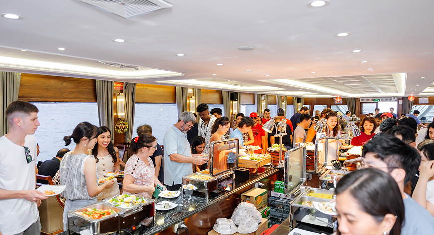 Indulge in a flavorful celebration of the sea with a diverse buffet or refined set menu featuring fresh-caught seafood and Vietnamese specialties. As the sun dips below Halong’s limestone peaks, elevate the experience with a French-style sunset canapé party, served with sparkling drinks on the sundeck.