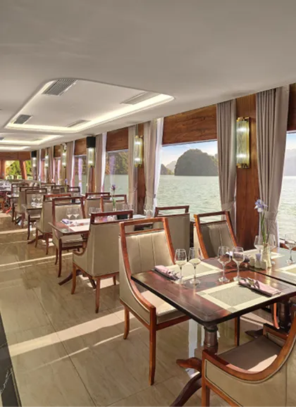 Savor fresh local seafood via buffet or set menu, then indulge in a chic sunset canapé party amid Halong Bay’s golden glow.